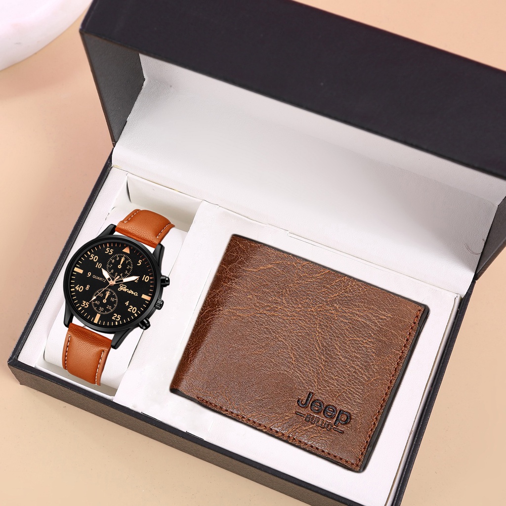 Colour:brown Material Quality:very good My husband likes because he get new watch and wallet