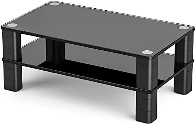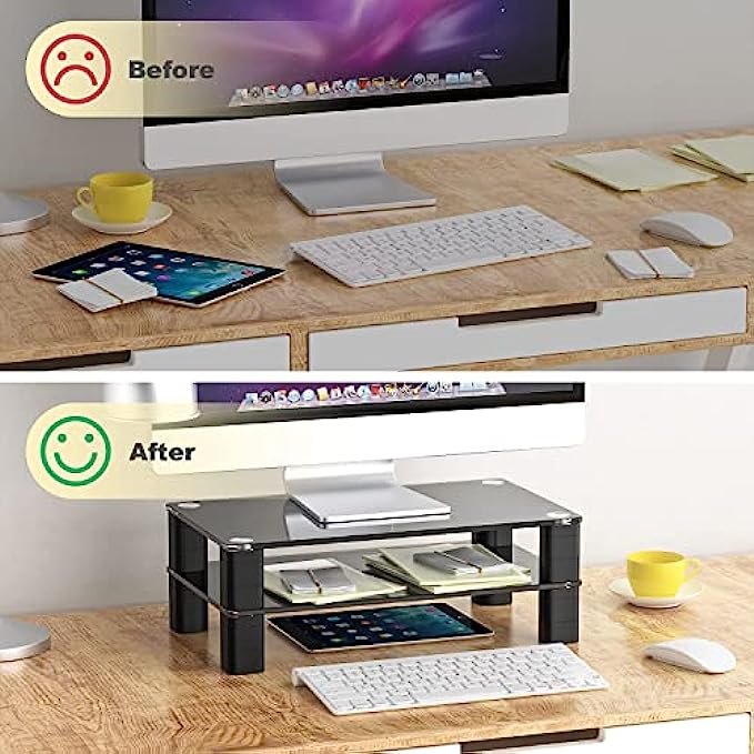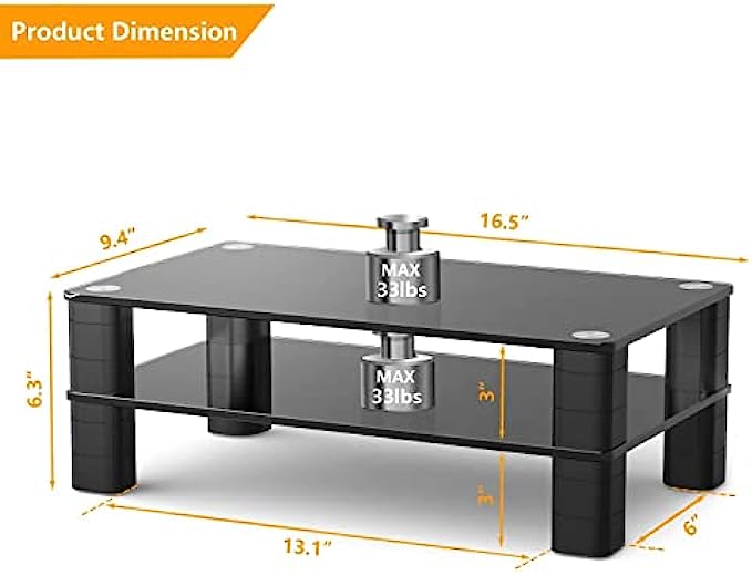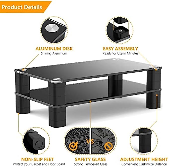 ☝STURDY AND STABLE STAND - The monitor stand riser is made of black tempered glass platform and sturdy plastic legs, it can easily hold up to 33 lbs laptop, monitor, printer, pc or all flat screen display. The legs are each made from three stackable sections that join together tightly and then into the top.