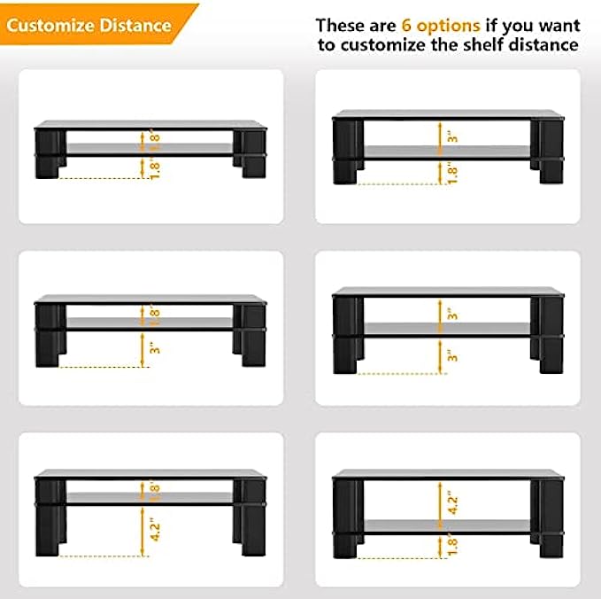 ☝MONITOR STAND SIZE - Product dimension 16.5"L * 9.4"W *6.3"H, this glass monitor stand is suitable for most of devices. The legs on the riser are very easy to adjust to the ideal height, total 6 different heights for optional. The space between legs is 13.1"L * 6"W, perfectly for storing your office supplies.