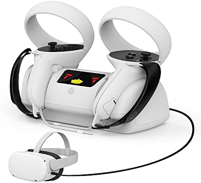 Fast and Safe Charging -- The Charging Station for Oculus Quest 2 charges the VR headset first, then the Oculus Quest 2 controllers. Our product only takes 3 hours to fully charge the quest 2 touch controllers with wrist straps. Included 2* rechargeable AA batteries have built-in overcharge protection, No heat and very durable, no harm to your VR controllers