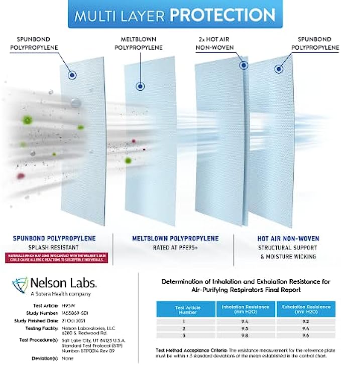 Superior Protection & Breathability - BNX’s 5-layer filtration technology provides maximum protection, comfort and breathability. The active filter layer of these N95 masks is composed of ultra-high grade electrostatically charged meltblown polypropylene. Extremely breathable up to 50%+ more breathable than NIOSH minimum requirement.