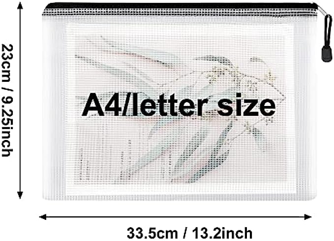 PRODUCT SIZE: 13.2" x 9.25"/33.5cm x 23cm. The mesh zipper pouch larger than letter size/A4 size, please confirm the size of the product carefully before purchase.