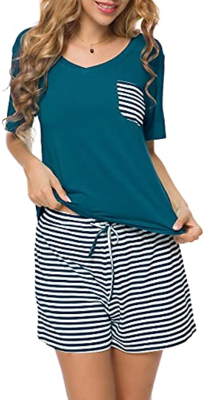 • 2 Elegant and simple styles to choose: 1, Beige trim decor around the neck and the bottom of shorts, solid colors; 2, Solid colored shirt top with real pocket decoration, classic stripes patterned shorts bottom