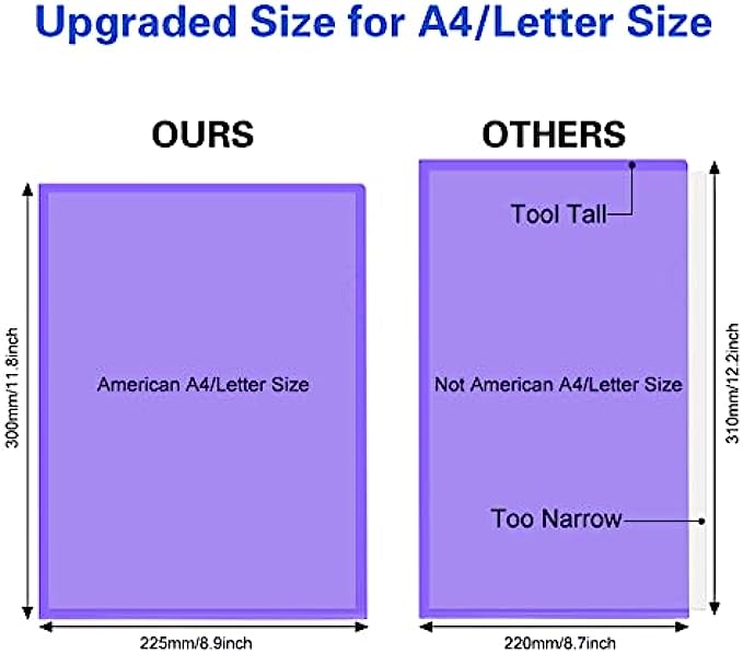 ❤Upgraded Size: 11.8 in x 8.9 in (300 x 225MM) is upgraded size, more suitable for US A4/ Letter Size. 22C(0.22 mm)thickness means thicker, with an increase of 57% compared to the standard thickness of 14C on the Amazon market, ultrasonic welding and stitching are not easy to crack