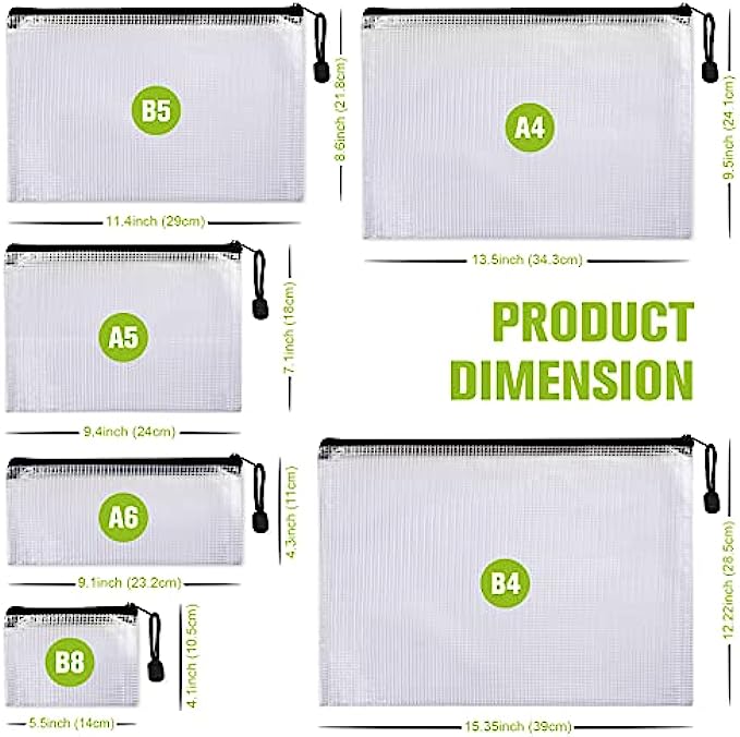【What You Can Get】24 pcs plastic zipper folders in 6 size(4pcs for each size). They are B4 (15.35×11.22Inch), A4 (13.5×9.5inch), B5 (11.4×8.6 inches), A5 (9.4×7.1 inches), A6 (9.25×4.25 inches), B8 (7.3×4.5 inches). Its convenient you to organize all kinds of sundries and meet the needs of daily work and life.