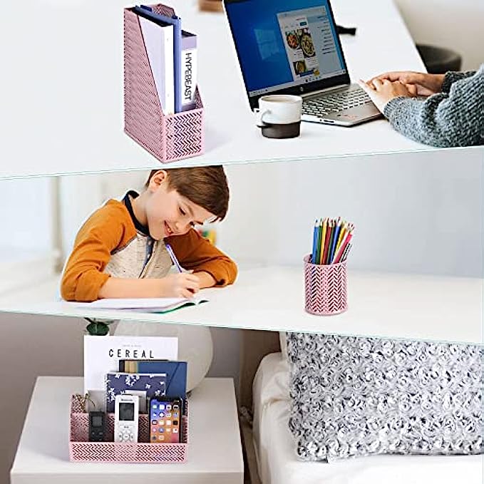 POPRUN Desk Organzier Set Cute Desk Accessories 4 Piece-Letter Sorter, Pen Cup, Magazine Holder and Paper Tray Office Organizer set - Cute Stationary Desktop Accessories for Women Desk Set- Pink