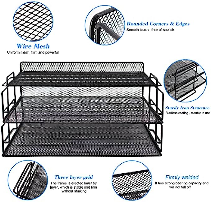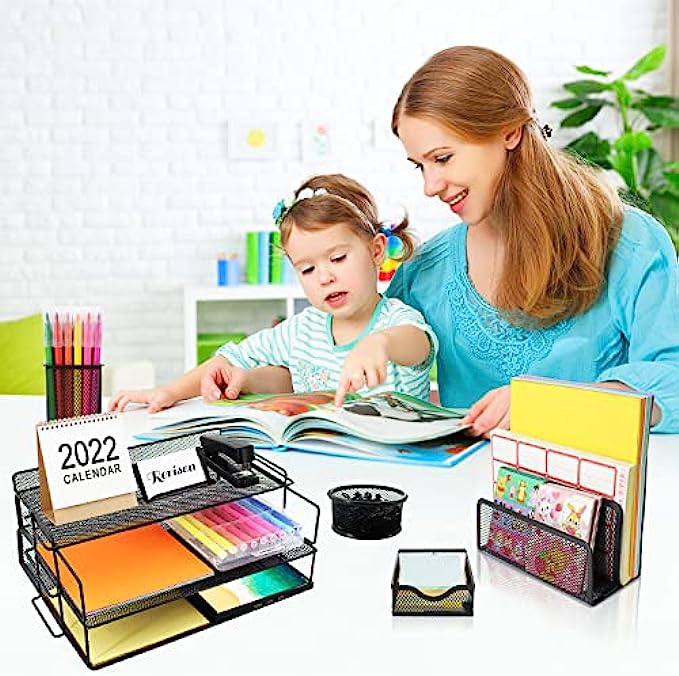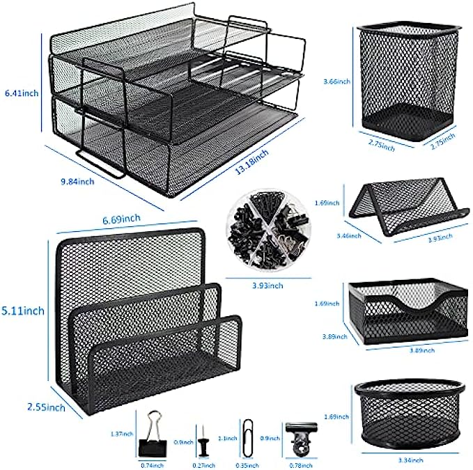 Rerisen Desk Organizers and Accessories, Mesh Metal Office Supplies Letter Tray Paper Organizers with Top Tray + 4 Holders + 1 File Sorter + 100 Desk Accessories for Desk, Office, Home and School.