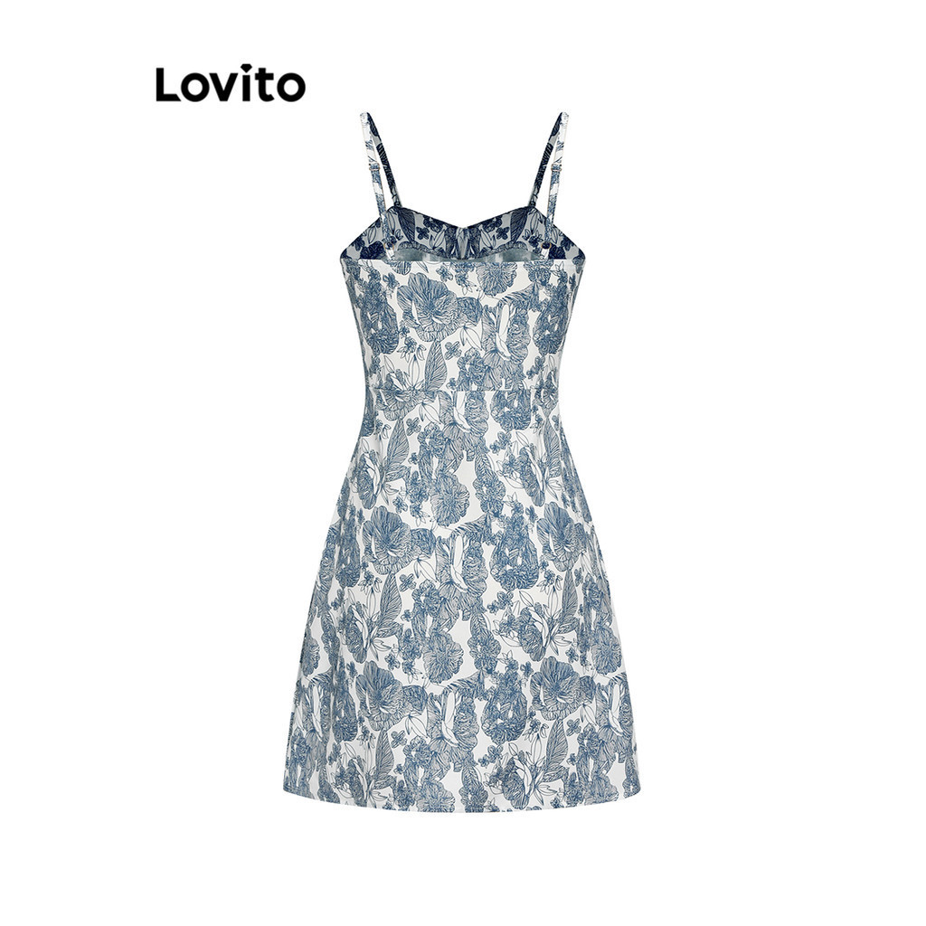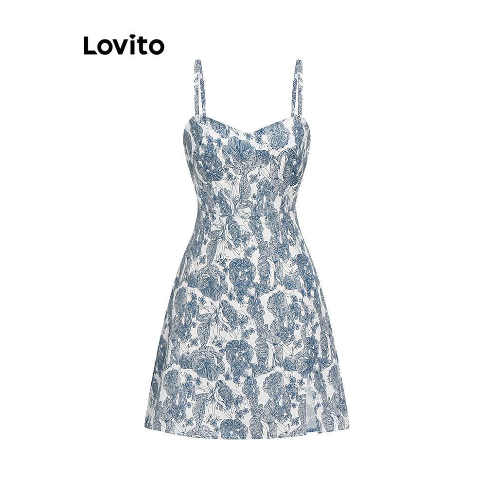 Lovito Boho Ditsy Floral Split Dress for Women L68ED195 (Blue)