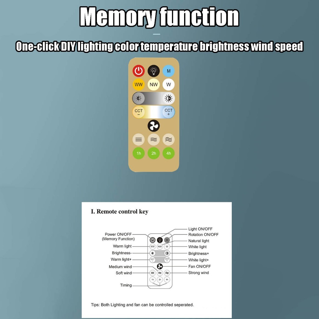 Performance:good Value For Money:yes Best Feature(s):fan can turn 360 degree position With the remote control, it is convenient to on and off the light and fan individually. The light can control from white to warm white by the remote control, 3 fan speeds, fan can rotate 360 degree and pause at position using remote control.