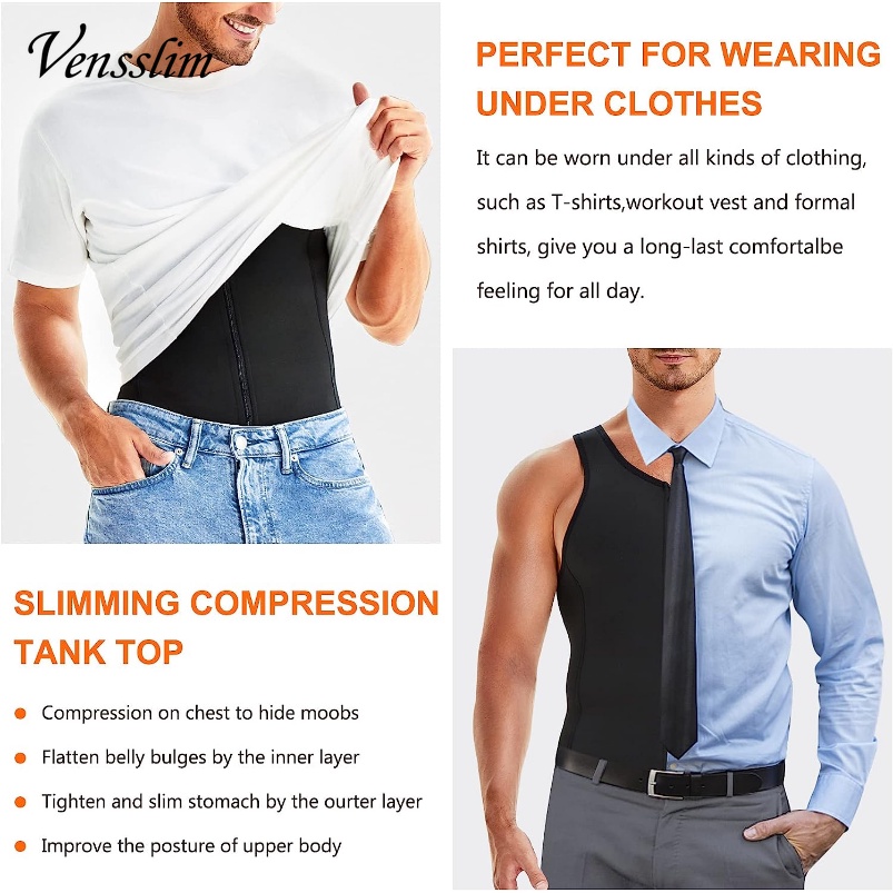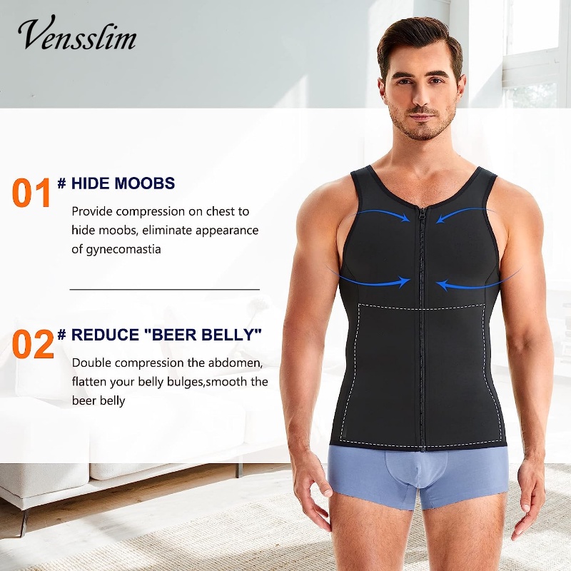 Vensslim Men Shapewear Slimming Body Shaper Compression Shirt with Zipper Tummy Control Waist Trainer Sweat Sauna Corset